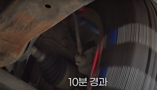 10분이 지나도 전혀 닿을 기미가 보이지 않았습니다. 직접 실험을 해보니 구조적으로 브레이크 호스와 스노우 체인과의 거리가 어느 정도 떨어져 있어 마찰에 의해 절단이 될 확률은 거의 없어 보이는 모습이었습니다.