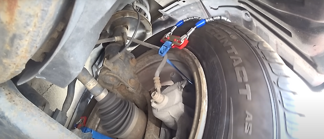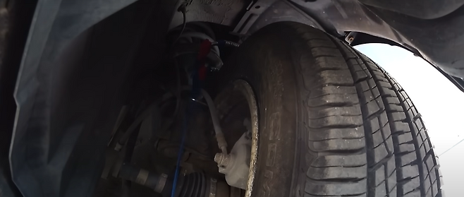 본격적으로 주행을 해보니 출발을 하자마자 브레이크 호스가 함께 딸려 나오며 버티지 못하고 바로 끊어지는 모습을 볼 수 있었습니다.