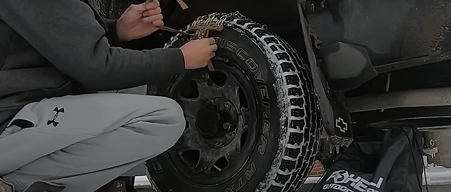 그러면 이번에는 스노우 체인 장착 시 실수로 호스를 같이 묶었을 때는 어떤 결과가 나오는지 실험을 해보도록 하겠습니다.