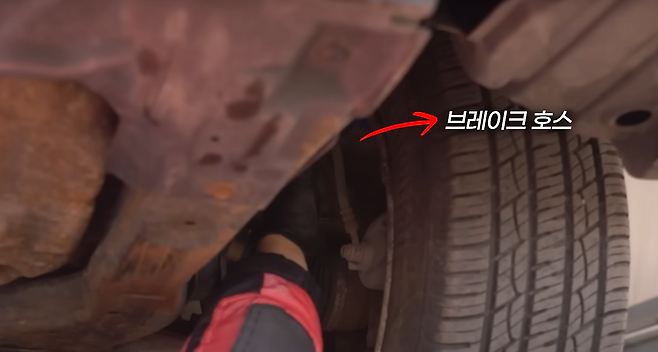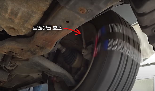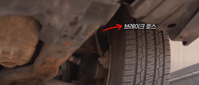 육안상으로 확인해 보았을 때 브레이크 호스에 닿아서 간섭을 줄 정도의 공간은 아니라는 게 보이는 모습이었습니다.