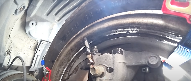 스노우체인과 브레이크호스가 같이 묶여있는 상태에서 바퀴를 살짝 앞으로 굴려보았을 때 브레이크 호스 라인이 따라오는 모습을 볼 수 있었습니다. 걸리게 되며 더 이상 움직이지도 않는 모습이었습니다.