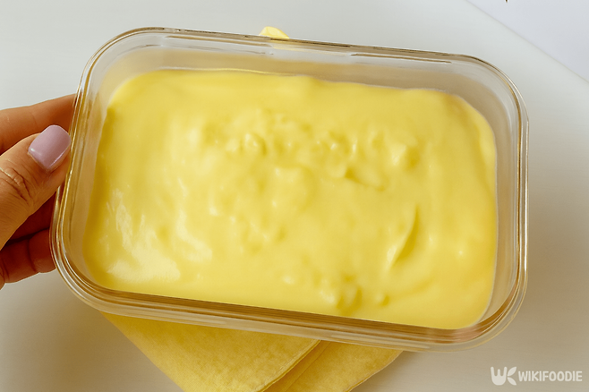 - 냉장 전 표면의 기포를 젓가락으로 터뜨리면 더 매끄럽게 굳는다.