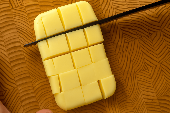 굳힌 푸딩을 큐브 모양으로 썰고, 표면에 노른자를 살짝 발라준다. 이 과정이 색감과 향을 살리는 비결이다.