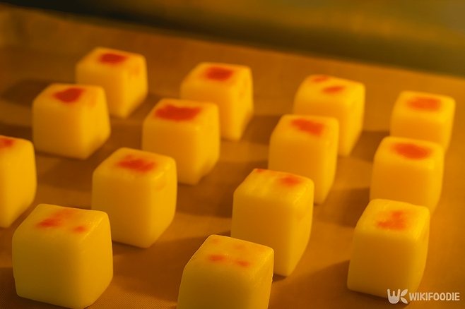 5. 굳은 푸딩을 큐브 모양으로 썰어 표면에 노른자를 얇게 바른다.