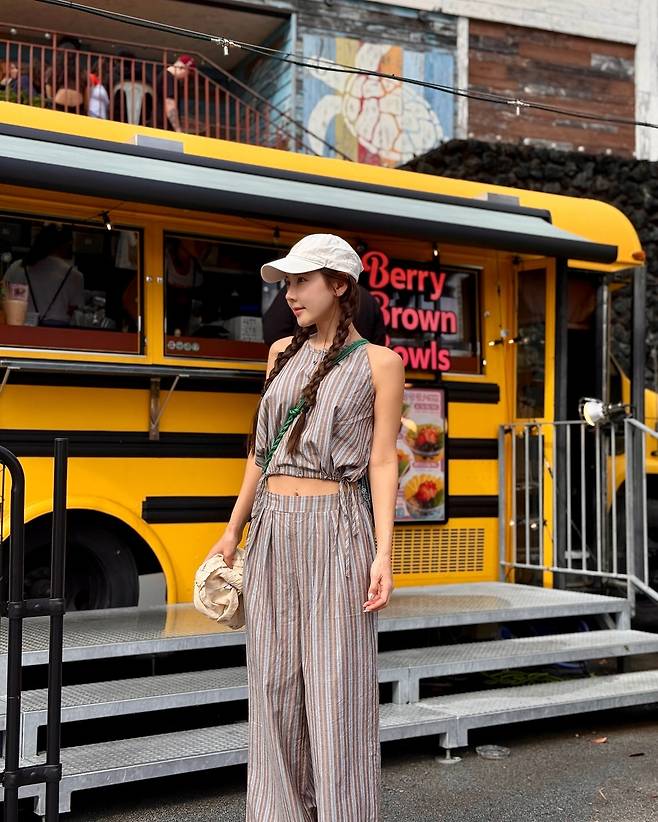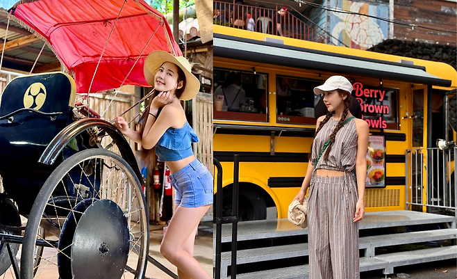 데님 크롭 톱과 하이웨스트 데님 쇼츠의 세트업으로 활동적이면서도 여성스러운 매력을 발산하고 있다. 밀짚모자와 함께 매치한 빈티지한 인력거 배경이 전체적인 룩의 완성도를 높이며, 크롭 톱의 적절한 노출과 하이웨스트 라인이 몸매를 돋보이게 하는 스타일링을 선보인다.