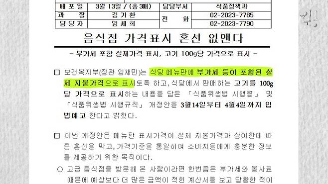 "100g 당 가격과 함께 1인분의 가격도 표시하는 경우에는 1인분의 중량과 가격을 함께 표시하도록 되어 있어요. 기본적으로 100g당 가격을 표시하도록 돼 있는 게 저희 취지거든요. 실제 영업자가 소비자들한테 제공되는 양이나 그램 수를 갖다가 명확하게 공지를 함으로 해서 사실 그거에 영업자가 혹시 속이거나 이런 걸 방지하기 위해서...