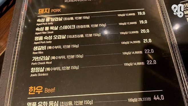 2013년 1월 1일부터는 메뉴판에 고기 가격을 표시할 때 부가세 등이 포함된 실제 지불가격을 표시해야 하고, 100g당 가격으로 명시해야 하는 법이 만들어지기도 했다. 그러니까 예를 들어 등심 150g에 3만3000원이라면 등심 100g에 2만2000원 이렇게 명시해야 하는 거다.