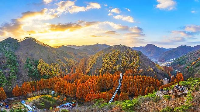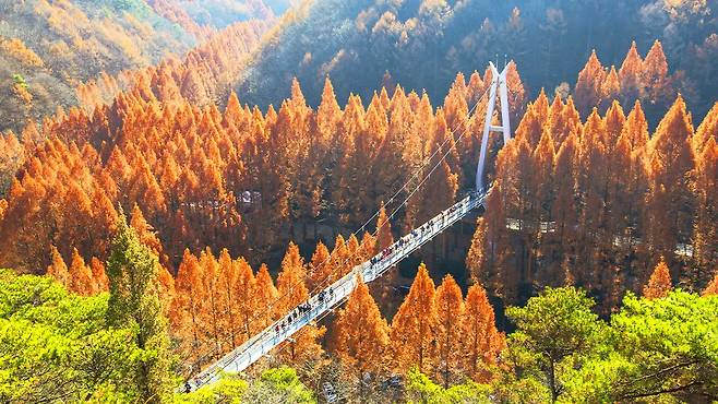 특히 140m 길이의 출렁다리는 단풍 감상에 스릴을 더한다. 다리 위에 서면 사방이 붉고 노란 단풍으로 둘러싸여 최고의 포토존이 된다. 스카이웨이가 웅장한 오케스트라라면, 이곳은 아늑한 실내악 같은 감성을 선사한다.
