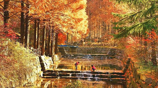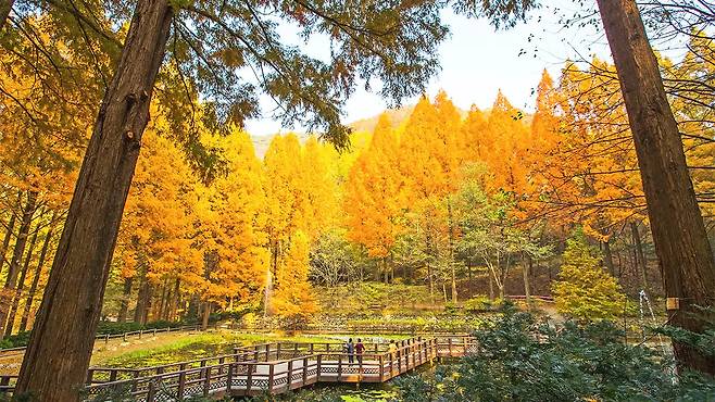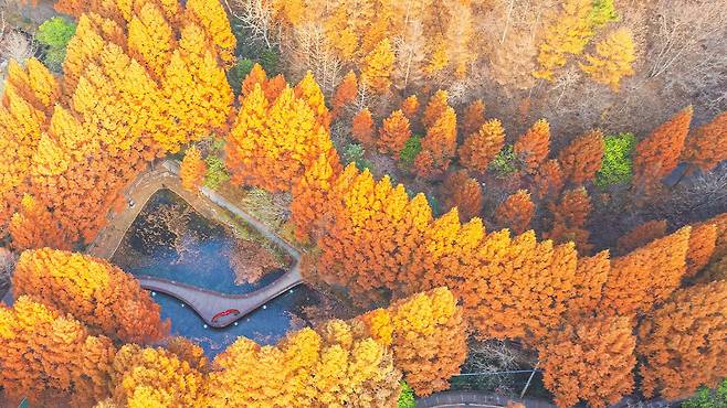 특히 상징적인 메타세쿼이아 숲은 가을이 되면 깊고 고고한 주홍빛으로 물들어 이국적인 정취를 자아낸다.