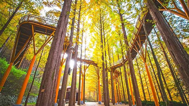 바로 대전 장태산자연휴양림에서만 가능한 특별한 경험이다. 이곳은 단풍을 입체적으로 즐길 수 있는, 국내 유일의 수직형 단풍 갤러리다.