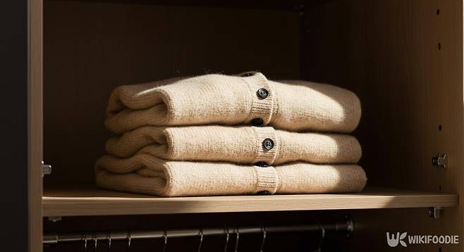 1) 옷걸이에 걸지 말고 접어서 보관: 울은 섬유 구조상 무게가 실려 늘어지기 쉽다. 옷걸이에 걸어두면 어깨가 튀어나오거나 전체 길이가 늘어지는 경우가 많다. 특히 가디건처럼 앞이 열리는 형태는 더 쉽게 변형된다. 가급적 평평하게 접어서 서랍이나 보관함에 넣는 방식이 가장 좋다.