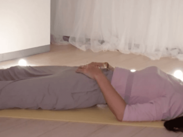 침대에 누운 채 천천히 숨을 들이쉴 때 배가 불룩해질 만큼 코로 4초간 깊게 마십니다.