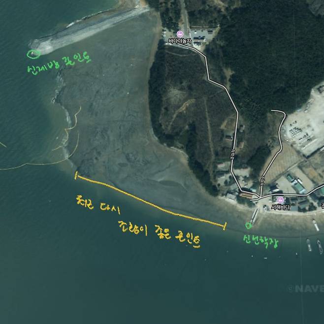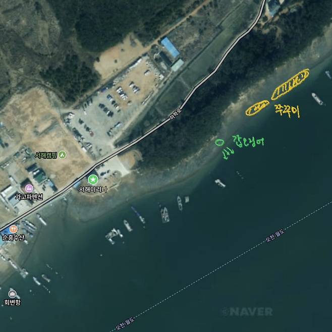 ▶ 노란색 - 서해마리나 부근의 쭈꾸미 포인트