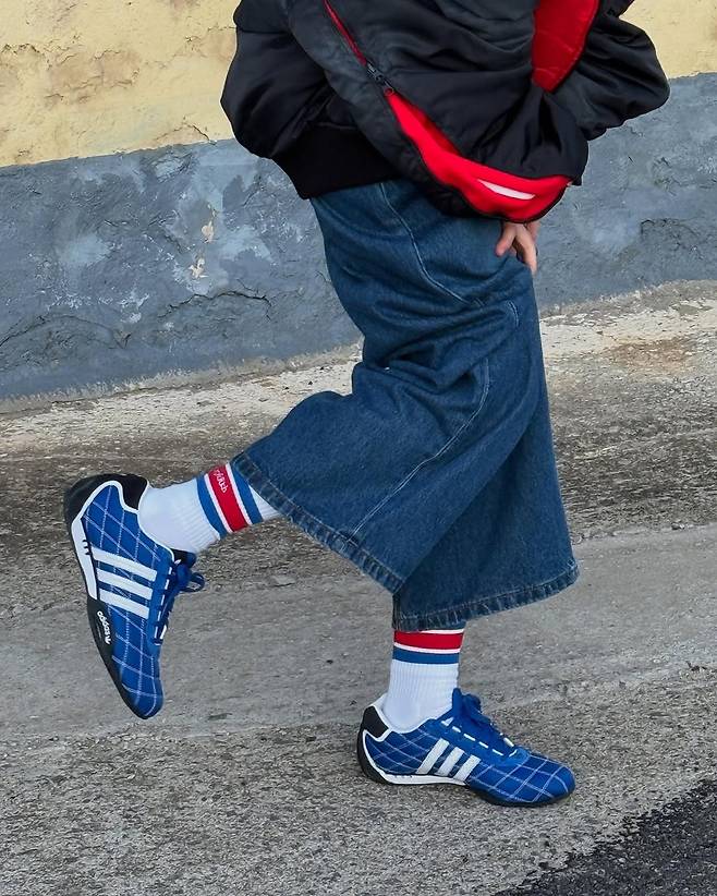 주목할 만한 또 다른 포인트는 슈즈다. 파란색의 타탄체크 플랫 슈즈는 상의의 파란 칼라와 컬러감이 맞닿으며, 룩의 통일감을 완성시킨다. 전체적인 톤을 비비드하게 끌고 가면서도 각 요소들이 조화를 이루는 점이 김진경 스타일링의 강점으로 읽힌다.