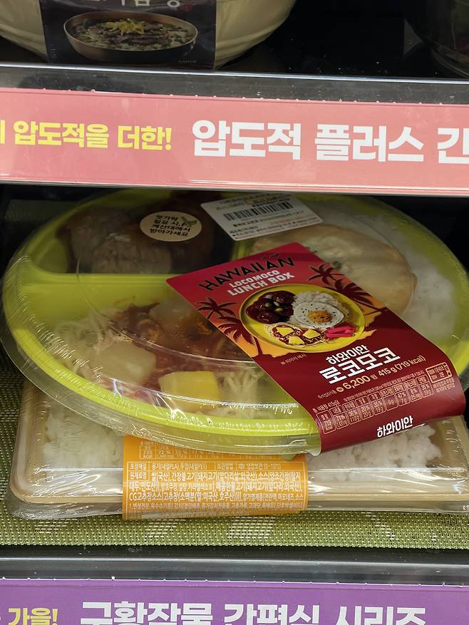 CU PB 스타일로 구성된 로코모코 도시락으로, 패티·계란·그레이비 소스 조합이 하와이식 맛을 잘 살려줘요.