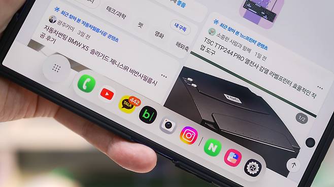 하단 앱줄(태스크바)은 여러 앱을 빠르게 전환할 수 있어 편리하긴 합니다. 하지만 폴드7처럼 화면이 큰 기기에서는 이 줄이 시선을 계속 끌어내려요. 특히 글을 읽거나 웹페이지를 볼 때는 눈이 자꾸 아래쪽으로 향해 집중이 흐트러지는 느낌이 생깁니다.