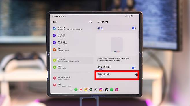 제스처 설정을 마쳤다면, 이제 한 번만 이전 화면으로 나가면 바로 위쪽에 '태스크바' 메뉴가 보입니다. '디스플레이' 설정 안에서 바로 찾을 수 있으니 다시 메뉴를 전부 열 필요는 없어요.
