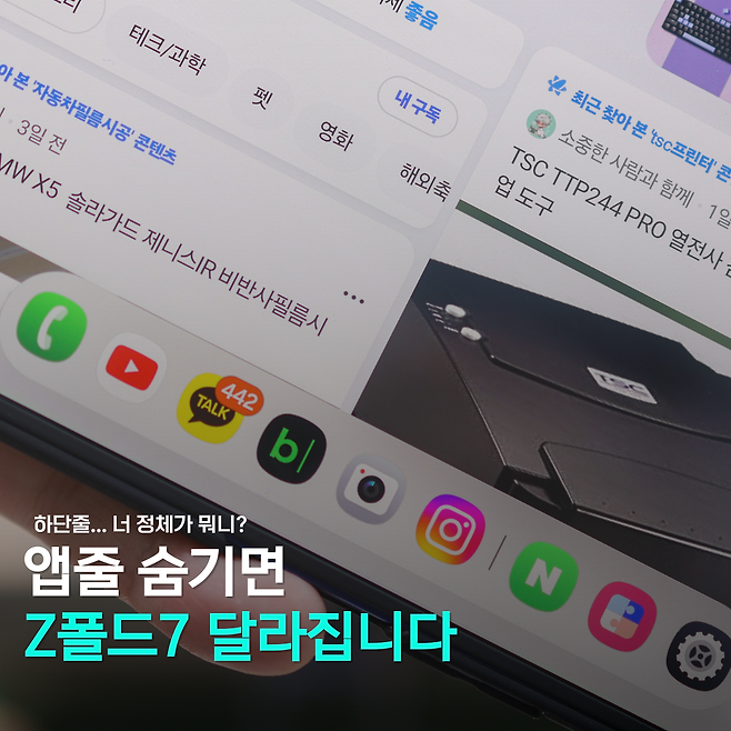 갤럭시 폴드3까지는 써봤지만, 최근까진 갤럭시 S24 울트라를 주력으로 사용했습니다. 그러다 이번에 Z폴드7으로 바꾸고 나니, 화면 아래에 줄지어 있는 앱 아이콘 줄(태스크바)이 눈에 계속 들어오더라고요.