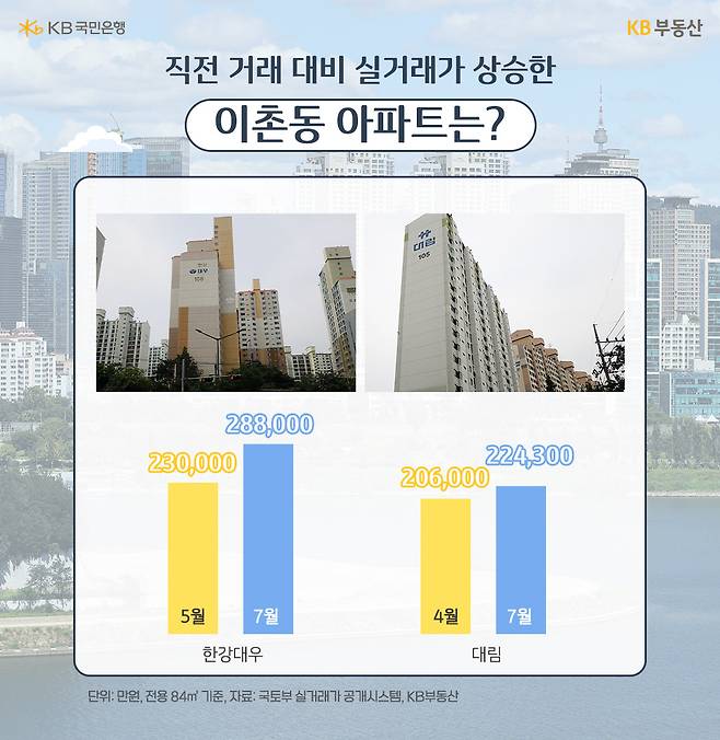 국토교통부 실거래가 공개시스템에 따르면, 이촌동 '한강대우' 전용 84㎡는 5월 19층이 23억원에 거래됐는데요. 7월 12일 28억8,000만원으로 5억8,000만원 오른 가격에 거래됐습니다. KB부동산 커뮤니티 내 단지글에 따르면 한강대우는 동부이촌동의 관문 같은 아파트로, 2000년에 입주한 26년차 단지이지만 계단식 구조에 지하 주차장도 있고 관리도 잘 돼 있는 편이라는 평을 받고 있습니다.
