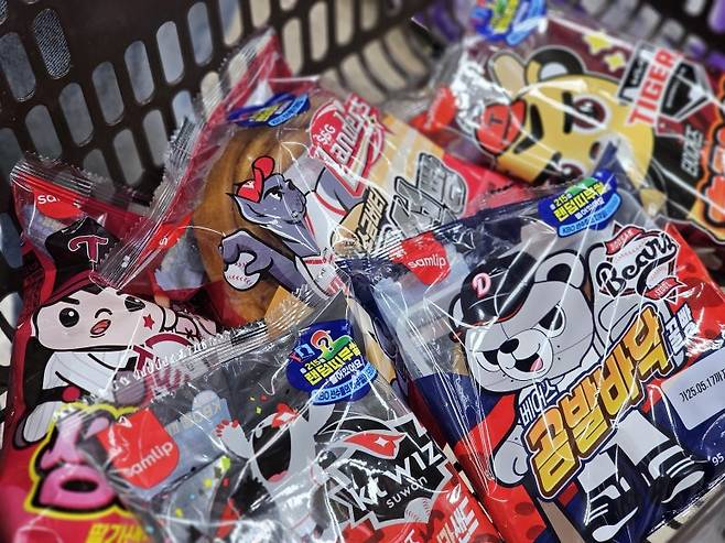 편의점 진열대 역시 뜨거운 야구의 열기로 가득 찼다. SPC삼립은 KBO와의 협업을 통해 ‘크보빵’ 시리즈를 출시해 엄청난 인기를 끌었다. 롯데 자이언츠를 제외한 9개 구단의 캐릭터를 포장지에 담은 초코롤, 딸기샌드, 블루베리 페스츄리 등 다양한 종류의 빵이 출시됐다. 빵별로 맛과 외형 등 특색이 다르기에, 좋아하는 구단 혹은 디저트 취향에 따라 빵을 골라 먹어 볼 수 있다는 점도 하나의 매력 포인트다. 하지만, 이 제품의 본체이자 팬들이 빵을 구매하는 주된 이유는 바로 ‘랜덤 띠부씰’. 빵을 구매하면 스티커를 주는 것이 아니라 스티커를 샀더니 빵이 따라왔다는 평가가 있을 정도로 랜덤 띠부씰은 팬들의 수집욕을 자극했다. ‘크보빵 오픈런’이라는 말이 생겼을 정도니 그 열기가 어느 정도였을지는 안 봐도 알 수 있을 듯하다.