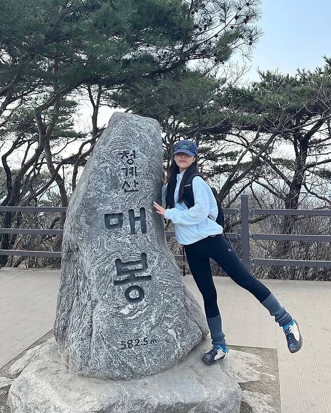 사진 속 민도희는 청계산 매봉 정상석 앞에서 산뜻한 표정으로 포즈를 취하고 있다. 전체적으로 톤온톤을 이룬 등산룩은 실용성과 트렌드를 모두 반영한 스타일로 구성되었다.