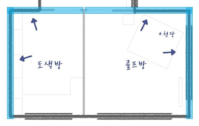 코로나19가 잦아들어서 수영장이 재개장되니 시간을 따로 내어 골프 연습장에 가는 게 어려워지더라고요. 그래서 큰 방은 골프연습방, 작은방은 도색방으로 꾸미기로 했어요!