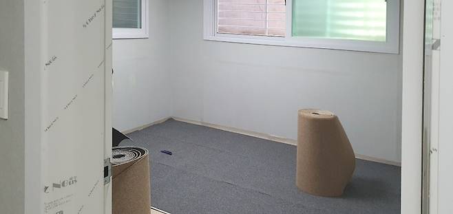 그래서 사이즈는 방 사이즈에 맞춰 주문할 수 없었고, 그냥 좀 더 조각조각 이어 붙였어요.