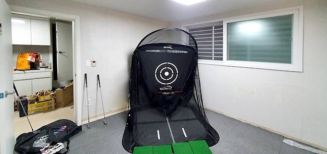 천정고가 높지 않아서 채를 휘둘렀을 때 공간이 어디까지 포용해 줄지 우려가 많았어요. 빈 방에서 채를 휘둘렀을 때는 드라이버까지도 가능하긴 했는데, 골프 네트를 설치하면 공간이 좁아지기 때문에 좌우 간격이 안 나와서 드라이버는 쉽지 않겠다 싶었어요.