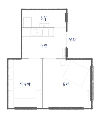 건물의 반지하 집은 이런 구조예요. 사이즈는 저희 집을 딱 반절 잘라 놓은 크기이고, 큰방 작은방 투룸에 복도 수준의 공용 공간, 화장실입니다.