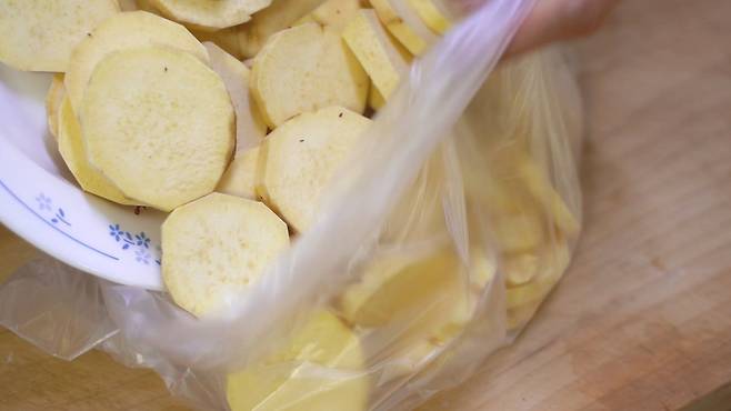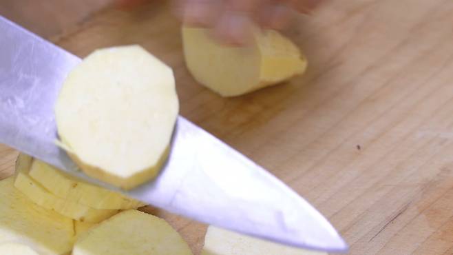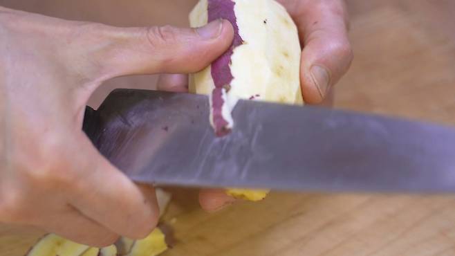먼저 고구마 껍질을 모두 제거하세요. 그리고 약간 도톰하게 단면을 썰어 준비하세요.