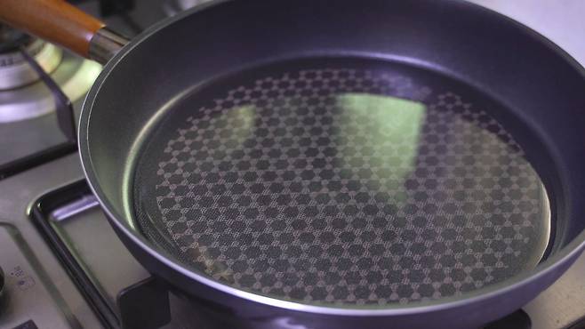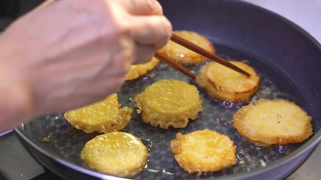 프라이팬에 고구마 절반 정도가 잠길 수 있을 정도로 기름을 두르세요. '중강불'에서 식용유를 데우고, 반죽을 떨어 뜨려 보세요. 반죽이 바로 떠오르면 기름 온도가 적당한 것이랍니다.
