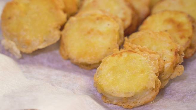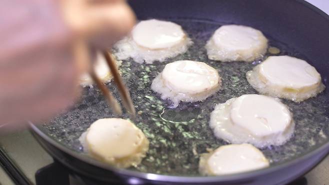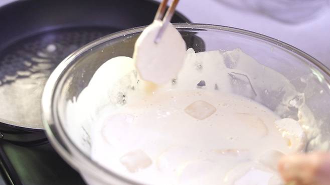 그러면 반죽에 고구마를 충분히 묻혀 기름에 튀겨 주세요.