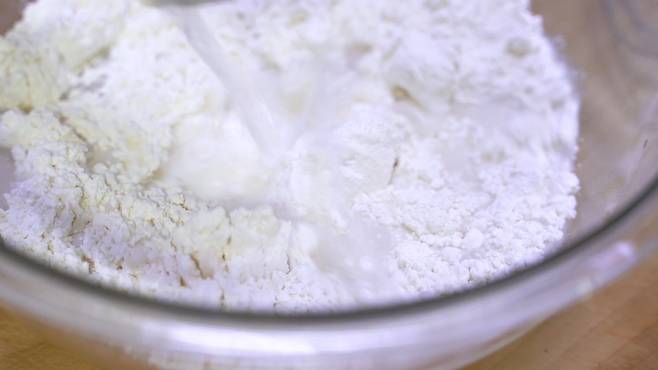 이제 반죽을 위해 튀김가루와 물, 꽃소금을 넣고 섞으세요.