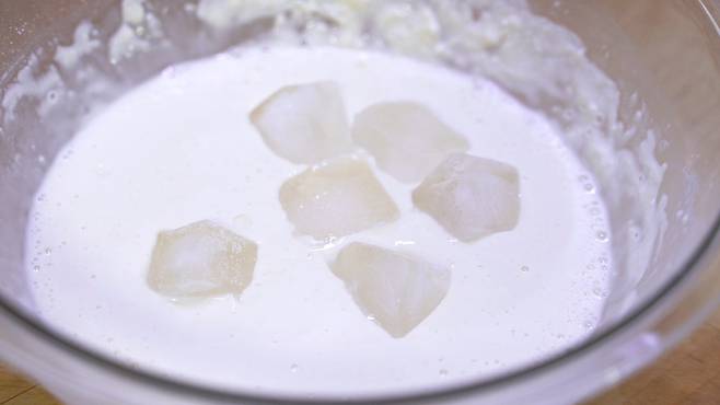 반죽에 얼음 넣고 반죽을 아주 차갑게 만들어 주세요. 이렇게 하면 반죽이 차가워지고 기름이 뜨거워 온도차가 나며 튀김이 더욱 바삭바삭하게 맛있답니다.