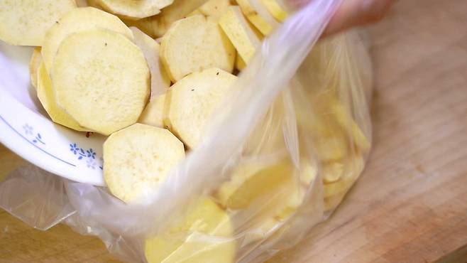 이제 비닐봉지에 밀가루를 넣고 고구마를 넣으세요. 그리고 마구마구 흔들어 밀가루를 입혀 주세요. 이렇게 하면 아주 손쉽게 모든 고구마에 밀가루를 묻힐 수 있어 좋아요.
