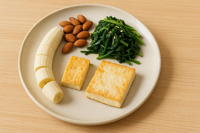 아몬드, 바나나, 시금치, 현미, 두부 등 식물성 식품에 풍부합니다.예: 바나나 + 귀리죽 + 두부부침