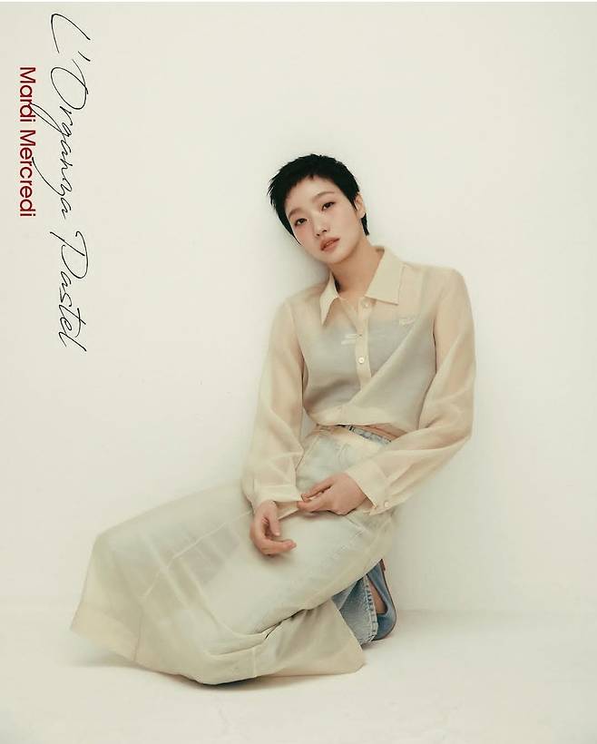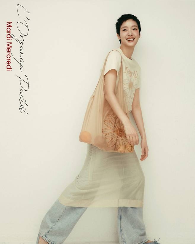 김고은은 은은한 베이지 톤의 데이지 프린팅 티셔츠와 시스루 소재의 오버랩 스커트를 착용하고, 그 아래에 루즈한 핏의 연청 데님 팬츠를 레이어드해 시선을 사로잡았습니다.