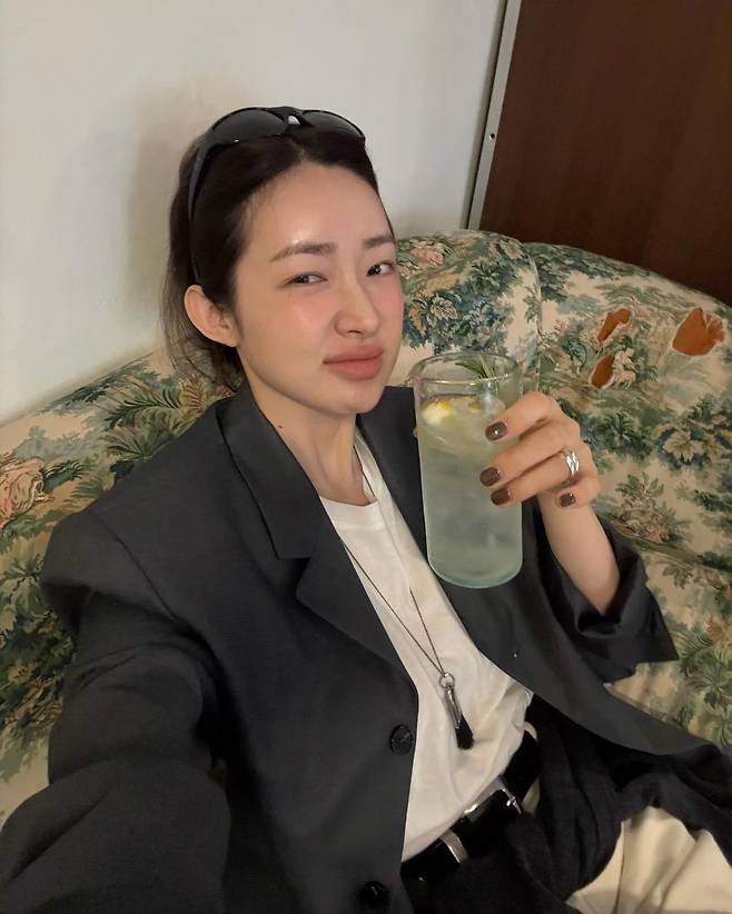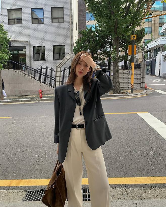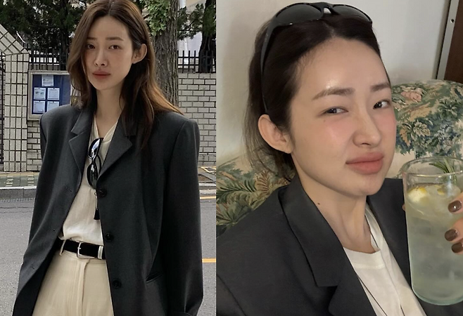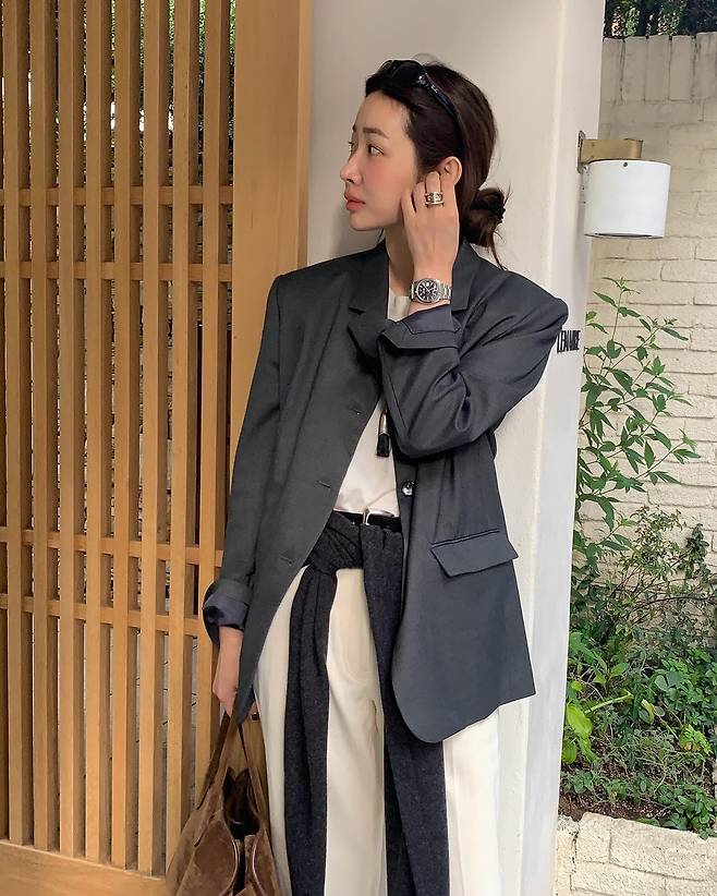 사진 속 차정원은 화이트 팬츠에 블레이저 자켓을 매치한 셋업 패션을 선보였습니다.