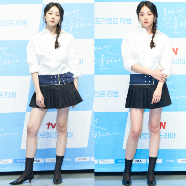 이주명은 화이트 셔츠와 플리츠 미니 스커트를 매치한 스타일로 등장했습니다. 그녀는 이 미니 스커트룩에 구두와 양말을 매치해 클래식하면서도 세련된 분위기를 연출했으며, 머리는 한쪽으로 땋아 귀여운 느낌을 더했습니다.