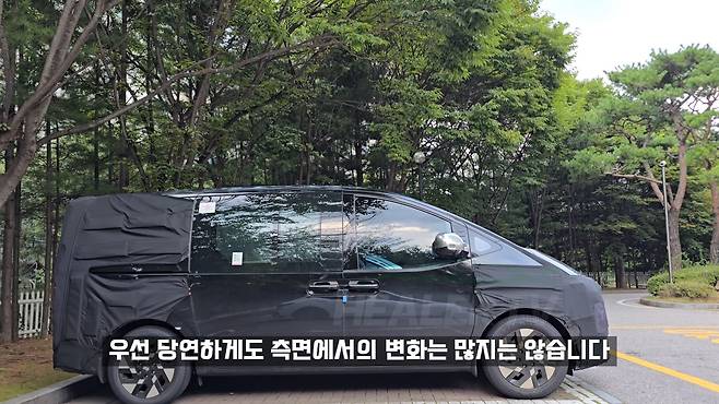 측면에서 확인되는 변화는 크지 않은 것으로 나타났다. 주요 변화점으로는 사이드 미러의 색상 변경, 문손잡이 색상 조정, 그리고 휠 디자인 변경 정도가 전부다. 전체적인 실루엣이나 차체 비율은 현행 모델과 동일하게 유지되면서 스타리아 고유의 미니밴 형태는 그대로 계승하고 있다.