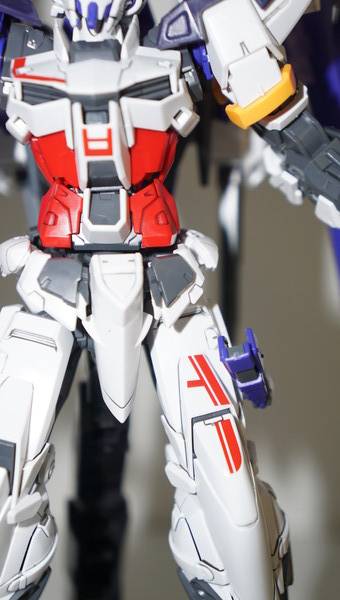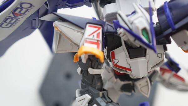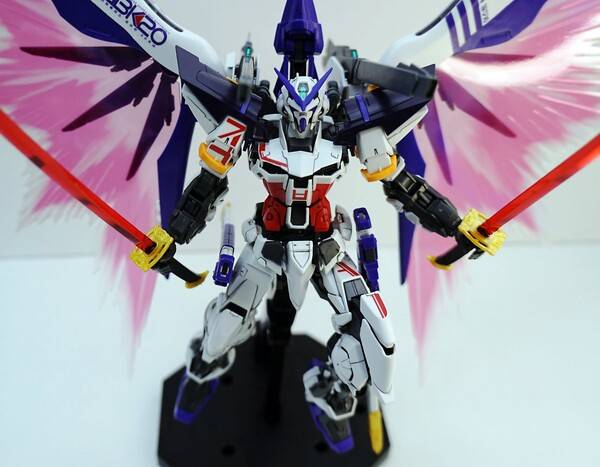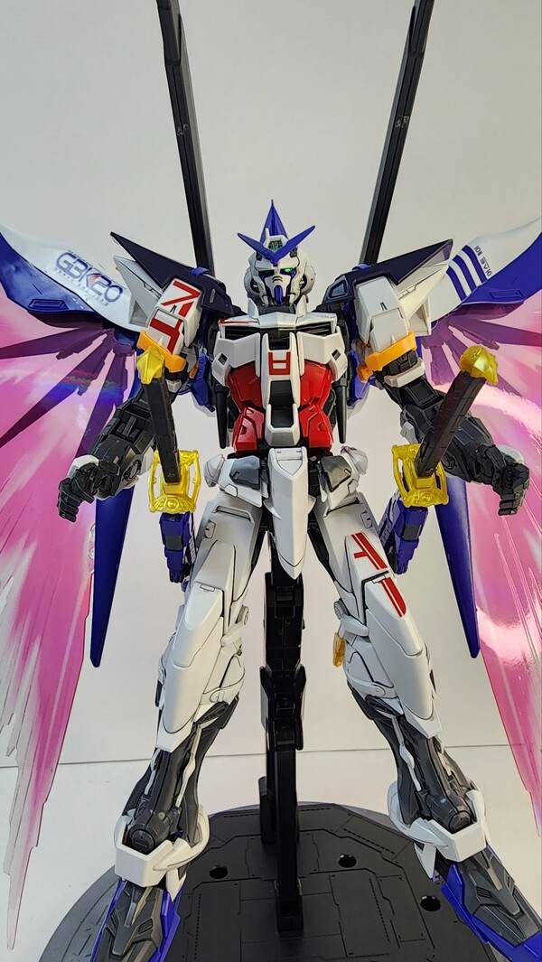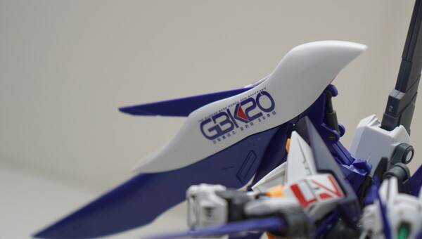 소체는 아스트레이 레드프레임을 바탕으로 블루프레임 부품을 부분적으로 도입했고, 백팩과 날개는 데스티니 건담의 파츠를 가져왔습니다. 다양한 기체들의 파츠들을 조합했지만 이질적이지 않고 잘 어울리는 모습을 보여주죠. 한국어로 되어 있는 데칼은 그야말로 한국 유저들에게는 선물과도 같은 요소입니다.