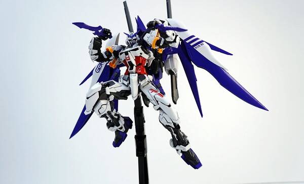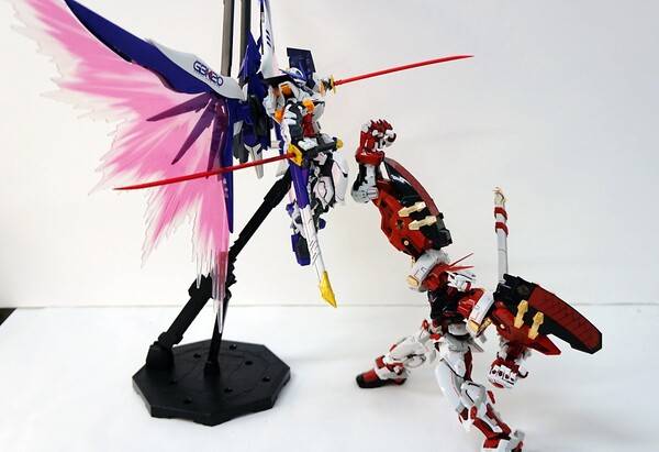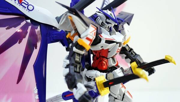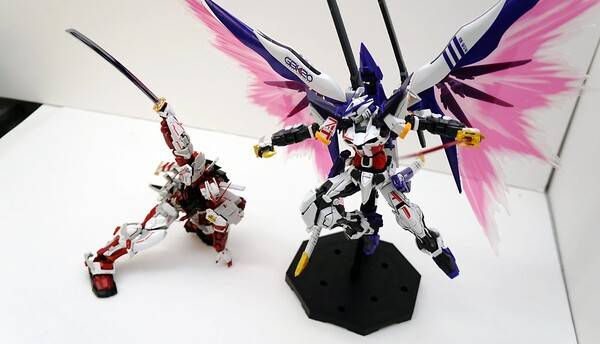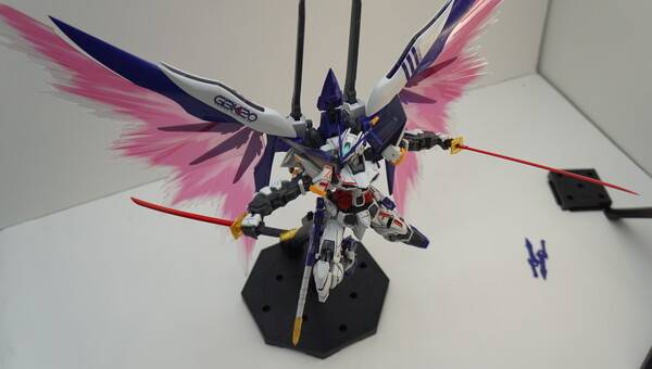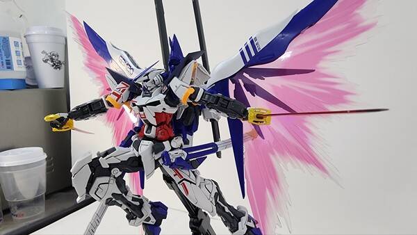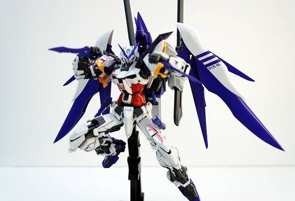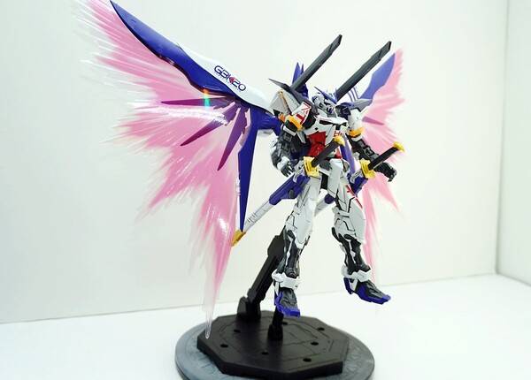 기본적으로 아스트레이 레드 프레임 본체에 데스티니 건담의 날개를 조합한 모습을 하고 있습니다. 색은 파란색, 검정색, 붉은색 등 다양한 색을 조합해 화려함을 더했죠. 원색의 기존 아스트레이에 비해 차분하고 단단한 느낌이 듭니다. 역시 포인트는 화려하게 뻗쳐 있는 빛의 날개죠. 큰 날개 때문에 자립은 어렵고, 베이스에 올려서 전시하는 게 좋을 것 같습니다. 베이스를 따로 구입하지 않고 포함되어 있다는 점도 혜자스럽죠.