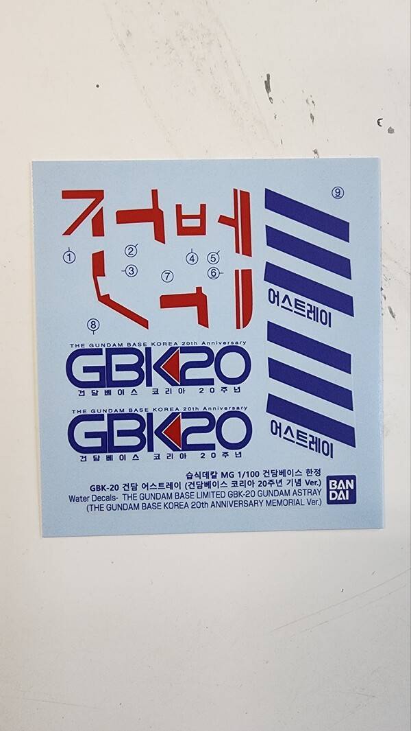 GBK 아스트레이는 습식데칼이 지원됩니다. 데칼 수도 많지 않아서 금방 붙일 수 있습니다. 데칼이 한글로 표현되어 더욱 의미가 있습니다. 특히 '건담 베이스'의 약자인 건베를 한글 문자로 형상화 한 데칼들이 보기 좋았습니다. 이 부분만 봐도 반다이남코가 한국판 건담을 진짜 신경써서 만들었구나 하는 걸 느낄 수 있었죠.
