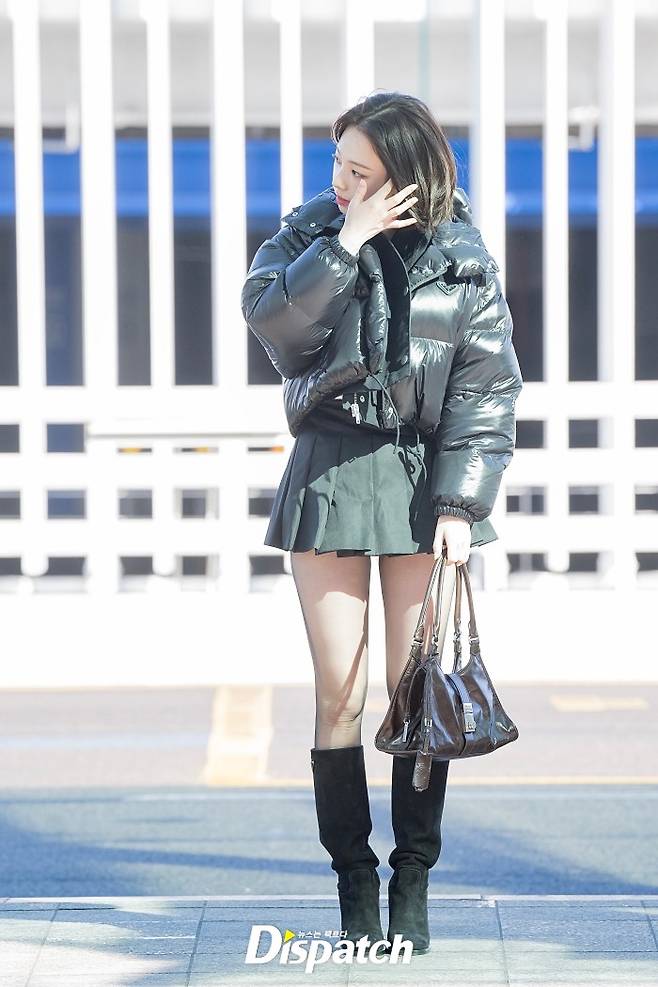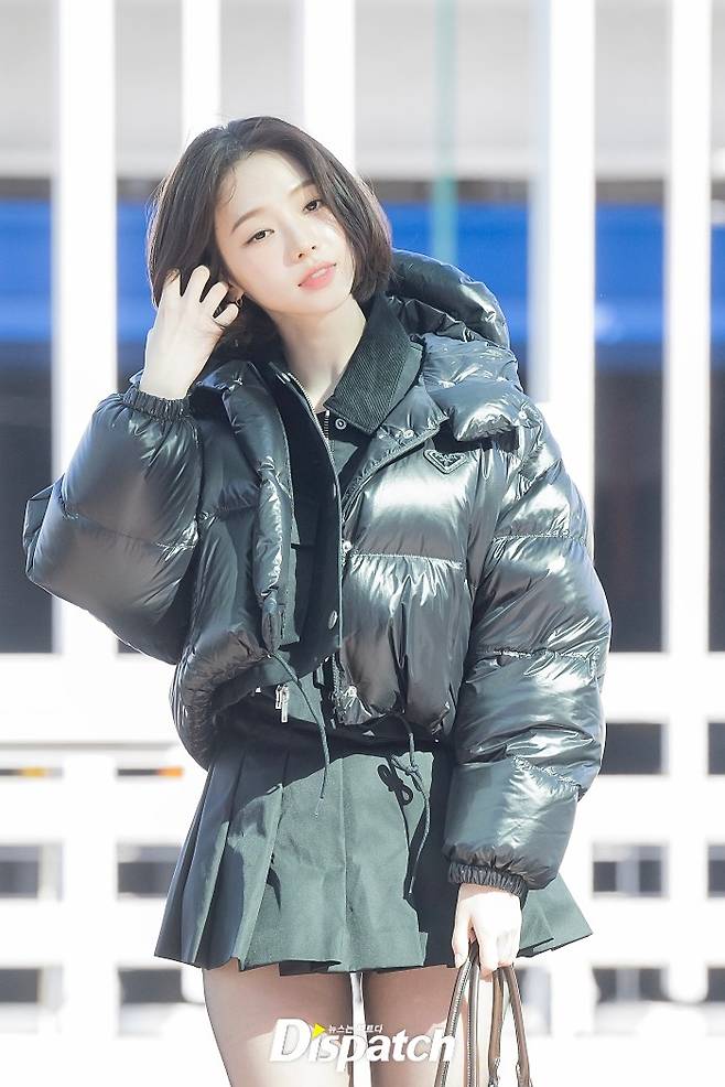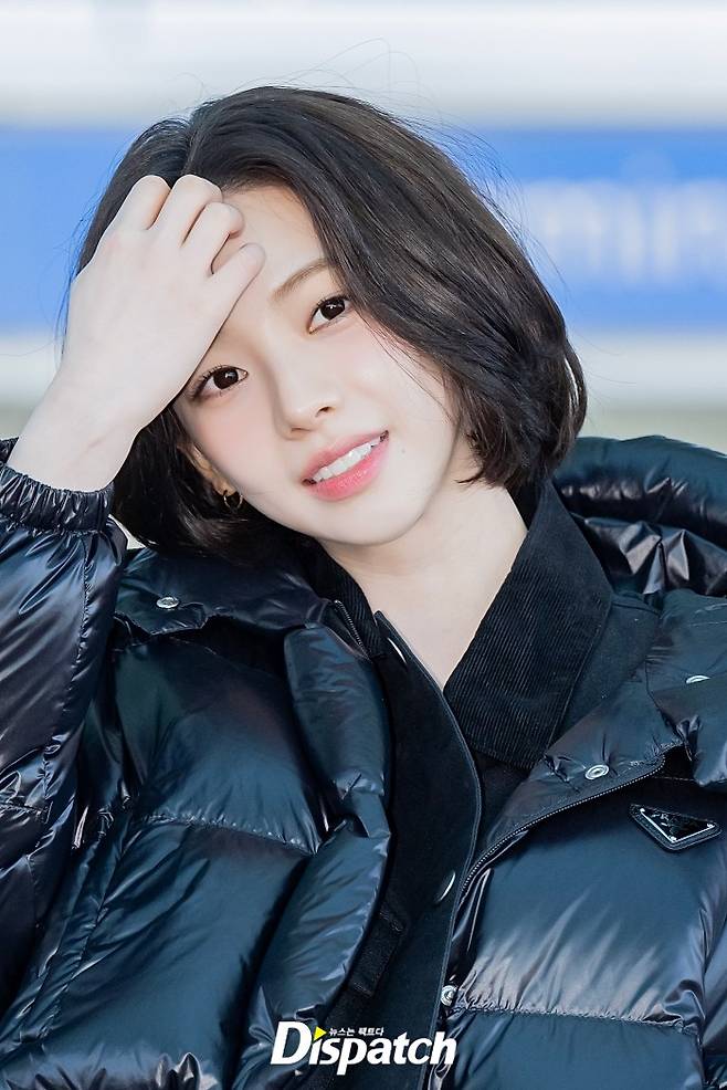 카리나는 숏 패딩 점퍼와 미니 플레어 스커트로 공항패션을 완성했다. 짧게 자른 단발 헤어스타일이 사랑스러움을 더했다.