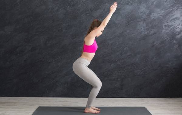 바닥에 서서 준비하세요. 무릎을 구부리고 엉덩이를 뒤로 보내면서 마치 의자에 앉는 듯한 자세를 취합니다. 상체는 가능한 직선을 유지하면서 약간 앞으로 기울입니다. 어깨는 뒤로 당기고 가슴을 펴서 등이 곧게 유지되도록 합니다. 이 자세를 유지하면서 복부 근육을 조이고, 호흡은 규칙적으로 유지합니다.