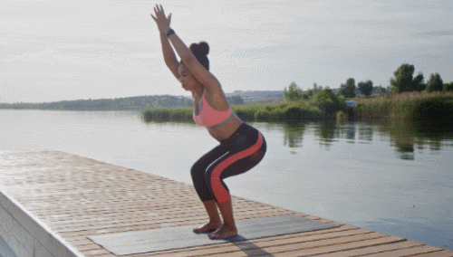 바닥에 서서 준비하세요. 무릎을 구부리고 엉덩이를 뒤로 보내면서 마치 의자에 앉는 듯한 자세를 취합니다. 상체는 가능한 직선을 유지하면서 약간 앞으로 기울입니다. 어깨는 뒤로 당기고 가슴을 펴서 등이 곧게 유지되도록 합니다. 이 자세를 유지하면서 복부 근육을 조이고, 호흡은 규칙적으로 유지합니다.