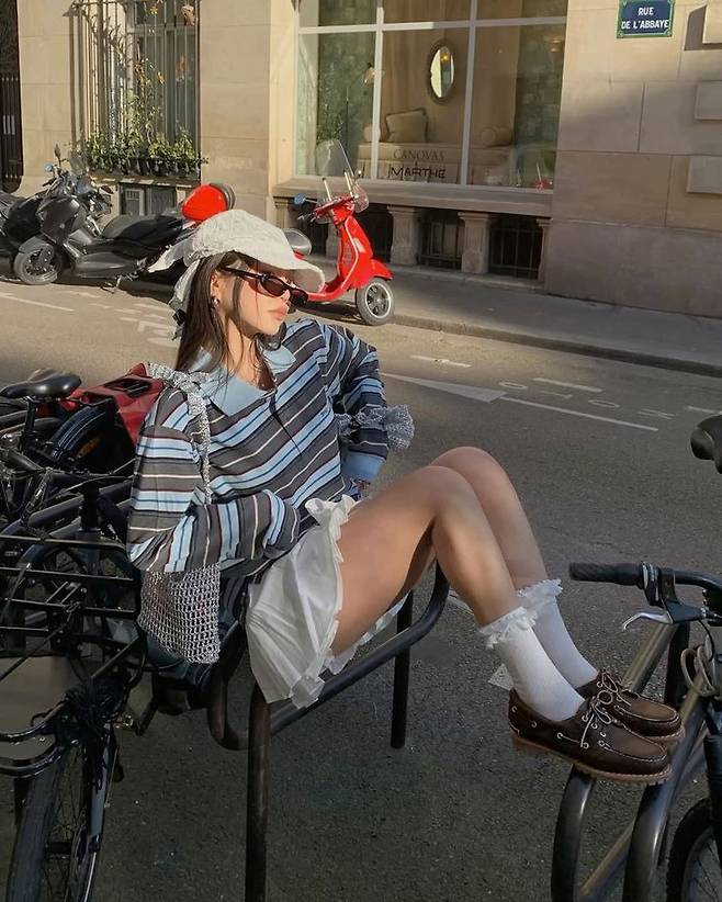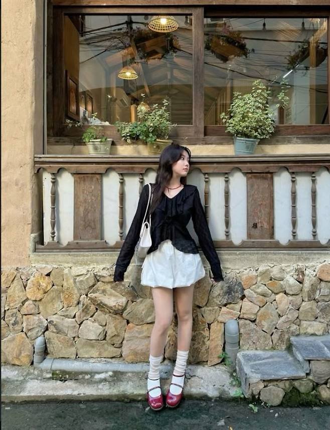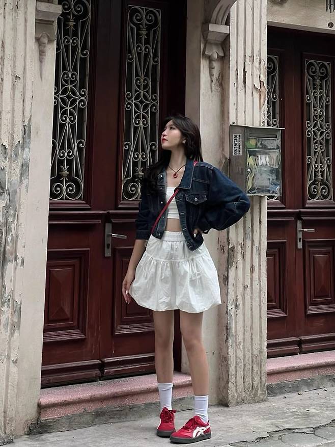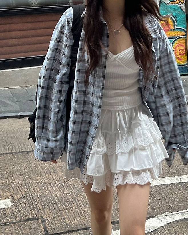 스커트 밑단에서 5cm 아래로 삭스를 살짝 보이게 해주면 요즘 유행하는 Y2K 감성을 낼 수 있고,