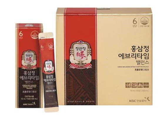 정관장 홍삼정 에브리타임 10ml 30포는 6년근 홍삼농축액 30%(고형분 64%), 정제수로 이루어진 제품이에요. 원료삼배합비율은 홍삼근 75%, 홍미삼 25%로 이뤄져 있어요.