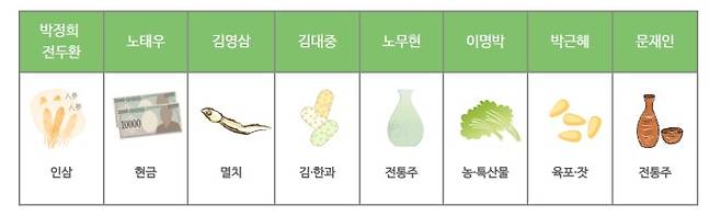 위에 소개한 제품 중 마음에 끌리는 게 없다면, 역대 대통령의 추석 선물을 참고해보는 것도 좋을 것 같습니다. 박정희 전 대통령의 인삼을 시작으로 김영삼 전 대통령은 멸치, 고 노무현 전 대통령은 전통주 등을 위주로 증정했다고 하네요.