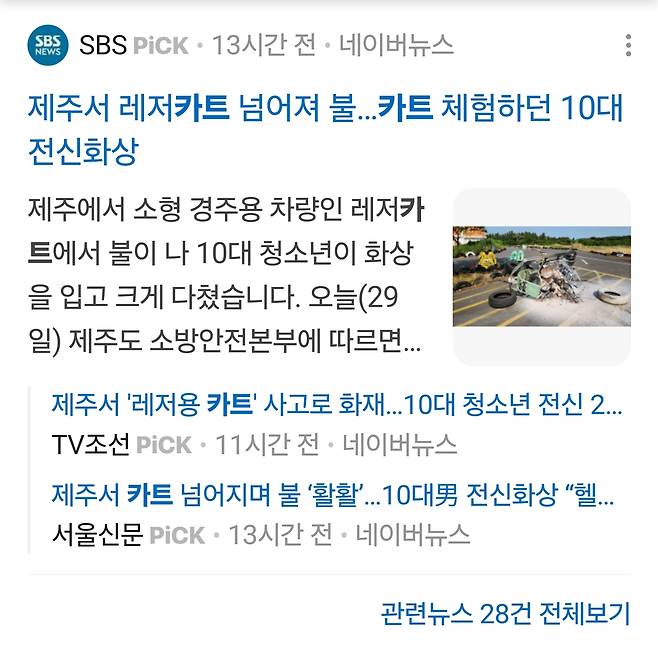 운행 중이던 레저카트가 전도되면서 화재가 발생했고, 이 사고로 레저카트에 타고 있던 A(17, 서울) 군이 2도 전신화상을 입은 것으로 알려졌습니다.